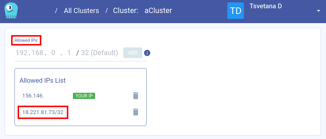 4. Scroll down to the Allowed IPs section and add the Rocketadmin IP address - 18.221.81.73, as trusted source, granting us access to your database: