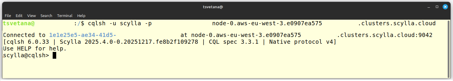 cqlsh -u scylla -p <your-password> node-0.aws-eu-west-3.<node-number>.clusters.scylla.cloud