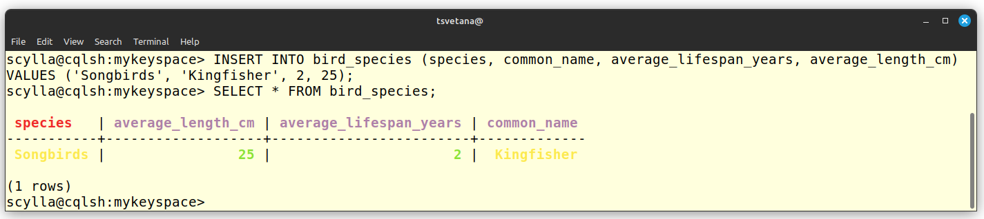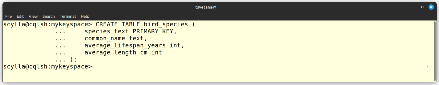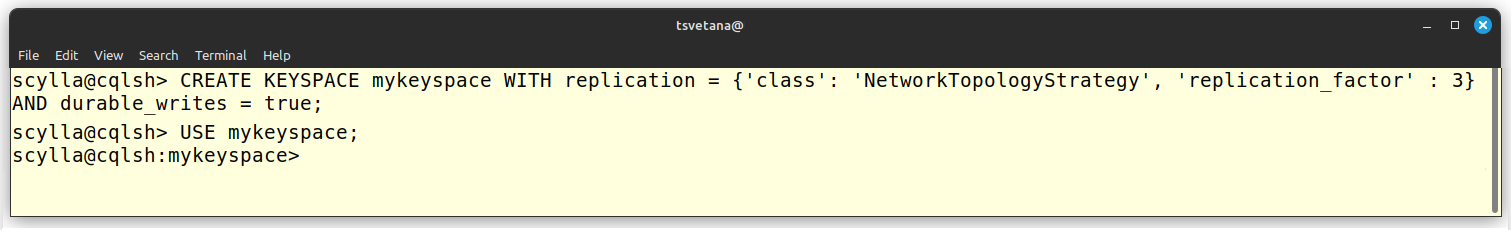 Upon successful connection to the cluster, you can create a keyspace and populate it with data: