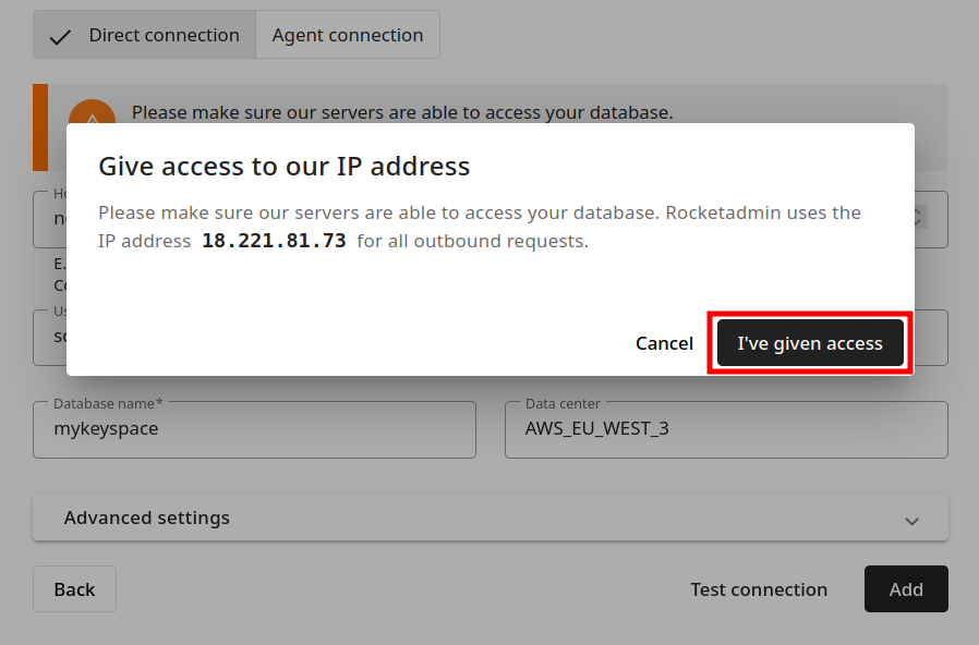 8. Since the Rocketadmin IP address has already been added to the list of allowed IPs, click on I've given access.