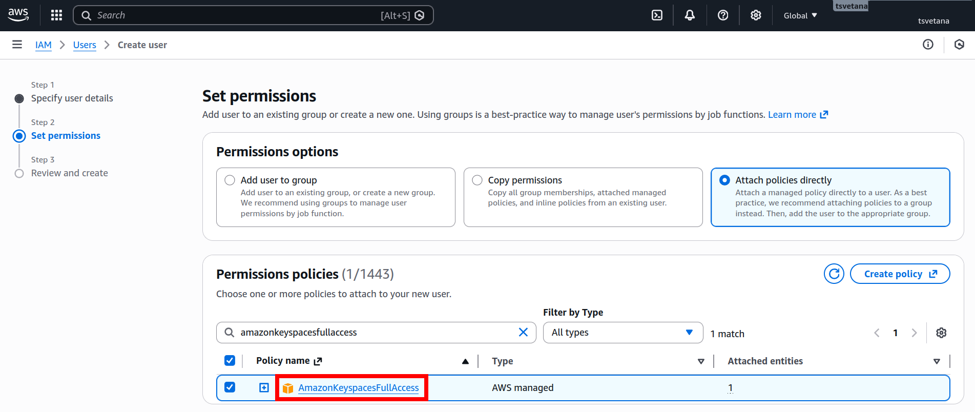 3. In the Permissions section add keyspaces policy depending on your preferences, for example full rights - AmazonKeyspacesFullAccess:
