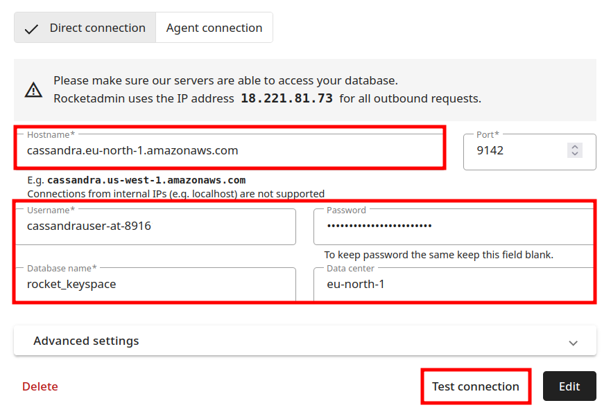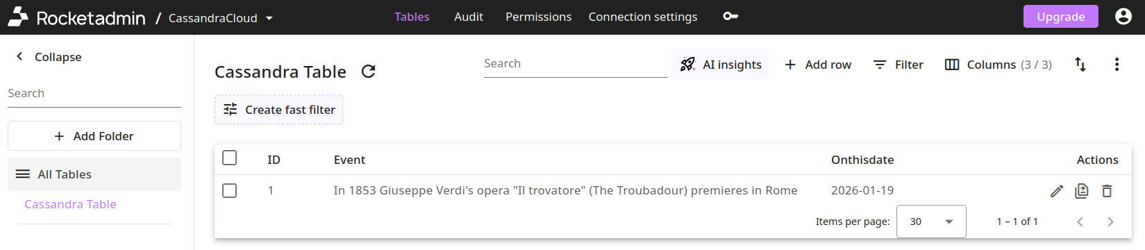 The final steps of this guide include creating a Rocketadmin connection to the CassandraDB keyspace and table.