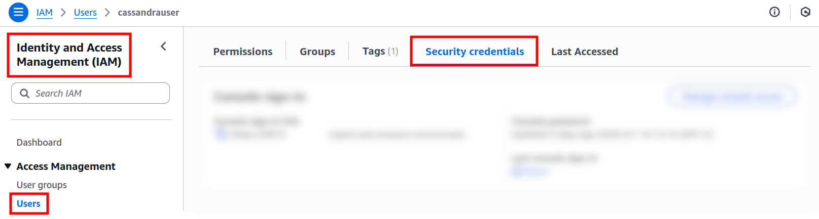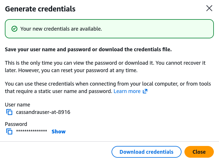 6. Scroll down to the Credentials for Amazon Keyspaces (for Apache Cassandra) and generate credentials: