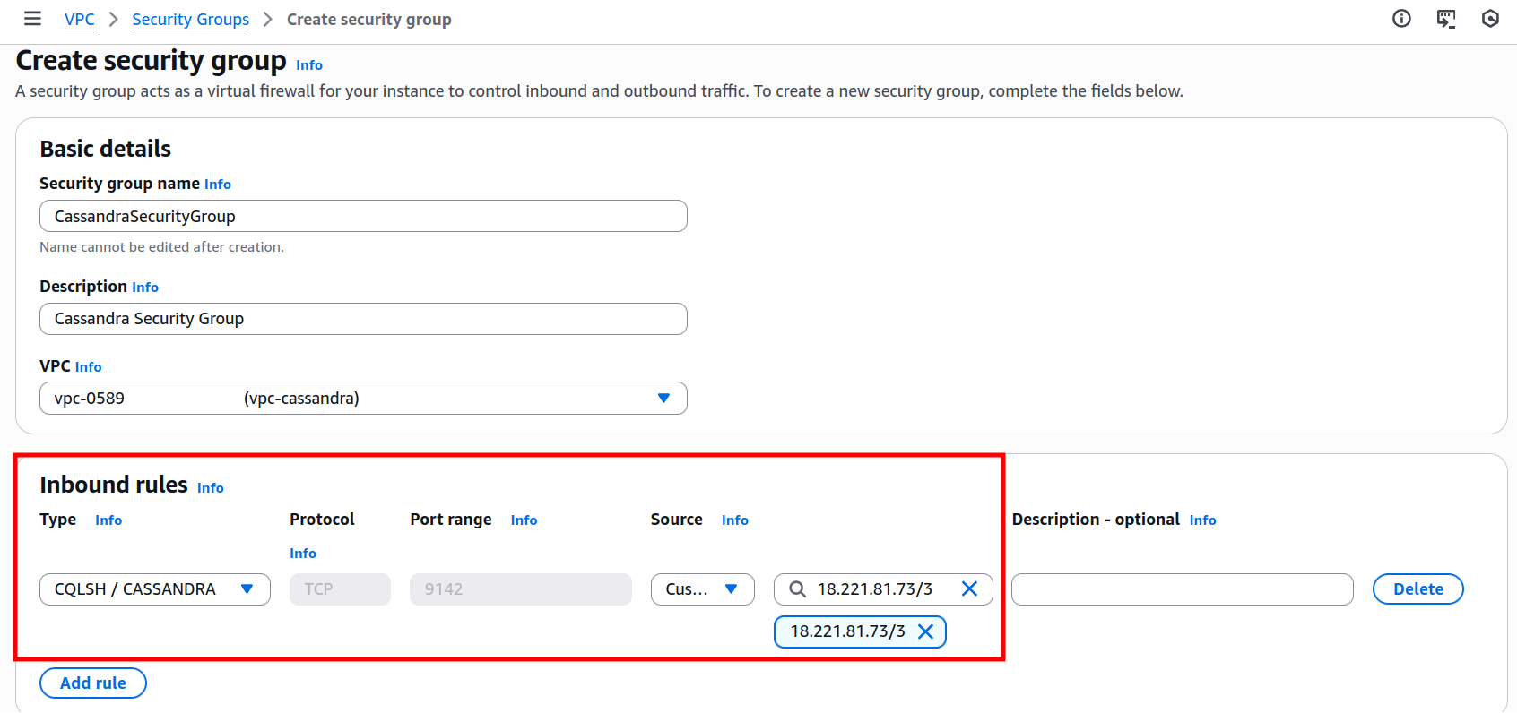 The last AWS configuration will allow Rocketadmin network access to the Amazon keyspace. Create (or use an existing) Virtual Private cloud (VPC) with a dedicated security group.