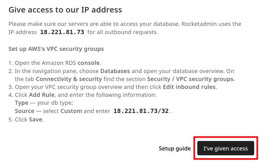 8. Since the Rocketadmin IP address has already been added to the list of allowed IPs, click on I've given access.