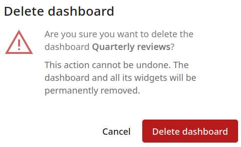 The Delete dashboard dialog appears with the message: "Are you sure you want to delete <dashboard-name>?"