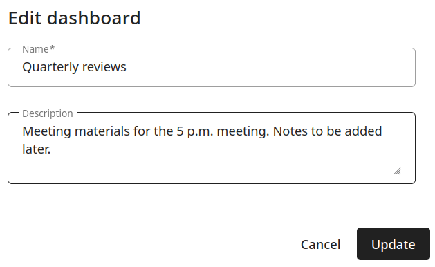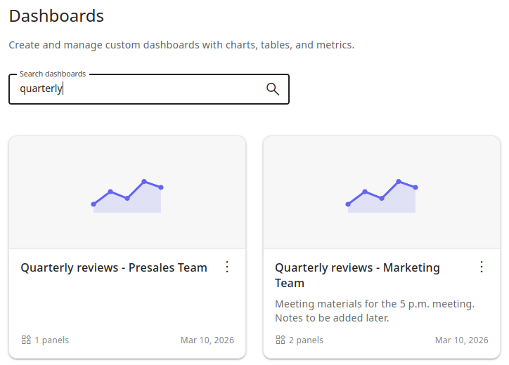 - in the Dashboards Search menu, enter (part of) the name/description of the dashboard: