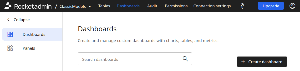 With Rocketadmin dashboards, you can create and manage custom interfaces and performance monitoring views that include data visualizations such as charts and valuable key metrics.