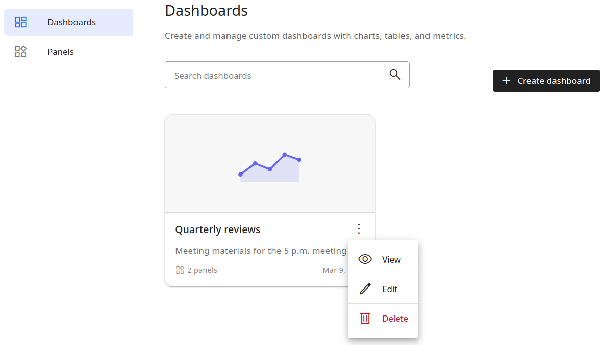 From the Dashboards menu, click the dashboard you want to add a panel to.