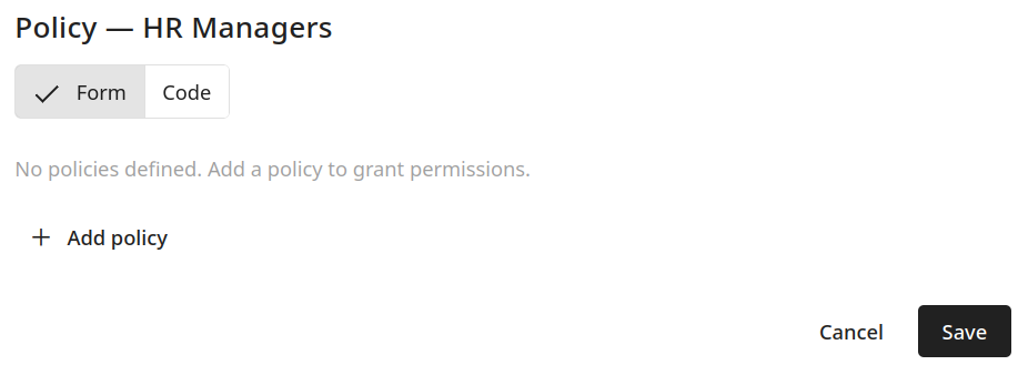 The Policy (Permissions) options of the new group are displayed for additional configuration: